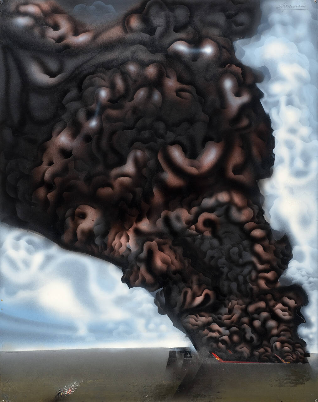 DescriptionA mass of dark, billowy cloudlike forms rise diagonally from the bottom right to the upper left of the vertical-format painting, expanding as they reach the top. Lighter clouds of pale blue, gray, and white surround the dark gray forms. Across the bottom edge a gray stripe suggests a horizon line. A think stroke of red paint appears as the dark clouds and the horizon line overlap. The painting has a smooth and shiny finish.Copyright© Estate of David Alfaro Siqueiros / Artists Rights Society (ARS), New York / SOMAAP, Mexico City