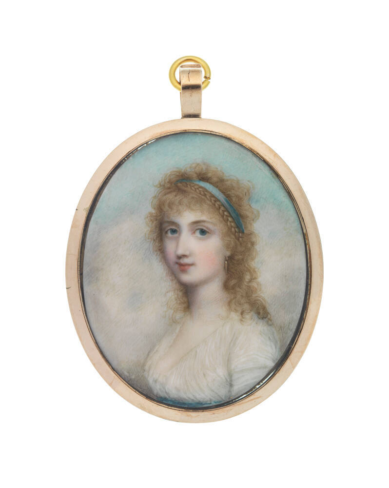 DescriptionPortrait miniature of a girl with natural hair wearing a white gown before a sky background.Exhibition History