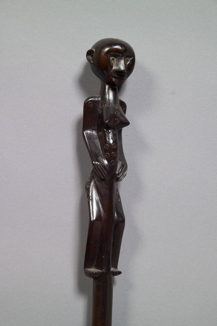 DescriptionA staff surmouned by a standing female figure with hands to the sides of the abdomen, with circle-and-dot scarification marks on the body and shoulders, and a fine, glossy black patina.ProvenanceAlan L. Lieberman, St. Louis [1];