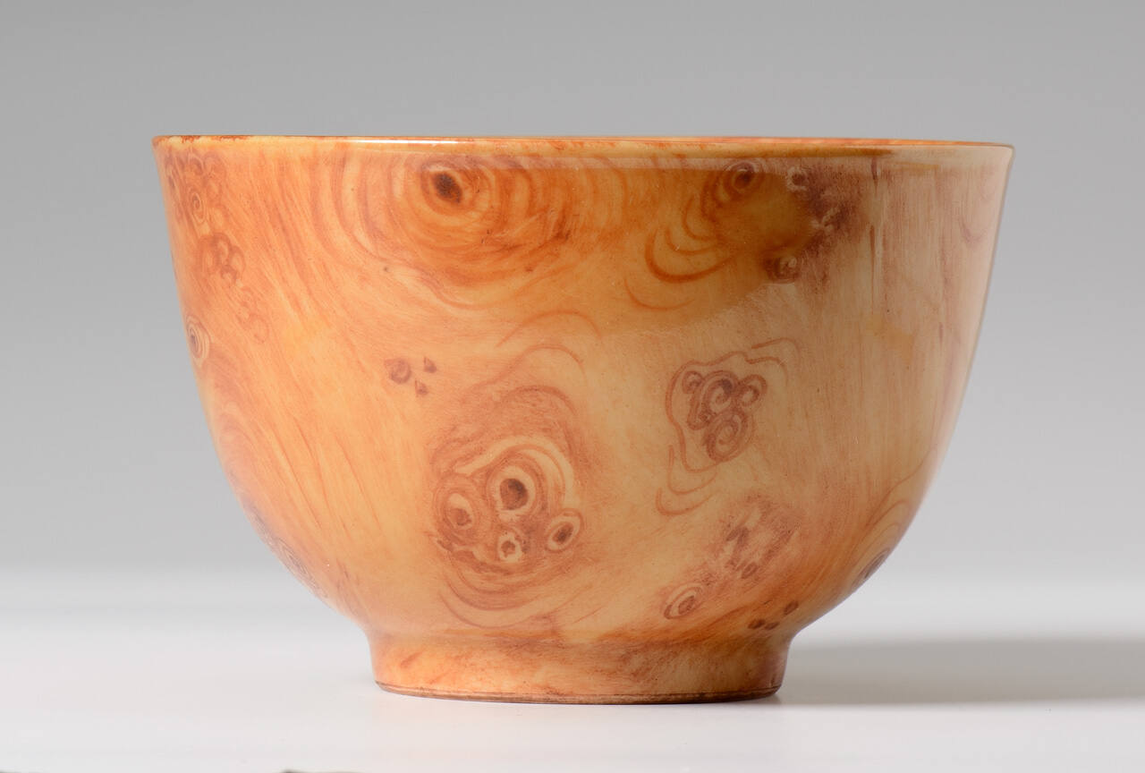 This cup has no reign mark, so scholars cannot be certain that it was made for the imperial palaces. By completely enveloping the cup in a brown glaze complete with burls and knots, the decorator was trying to trick the eye into thinking that it is made from wood. It may have been for this reason that the reign mark was omitted.