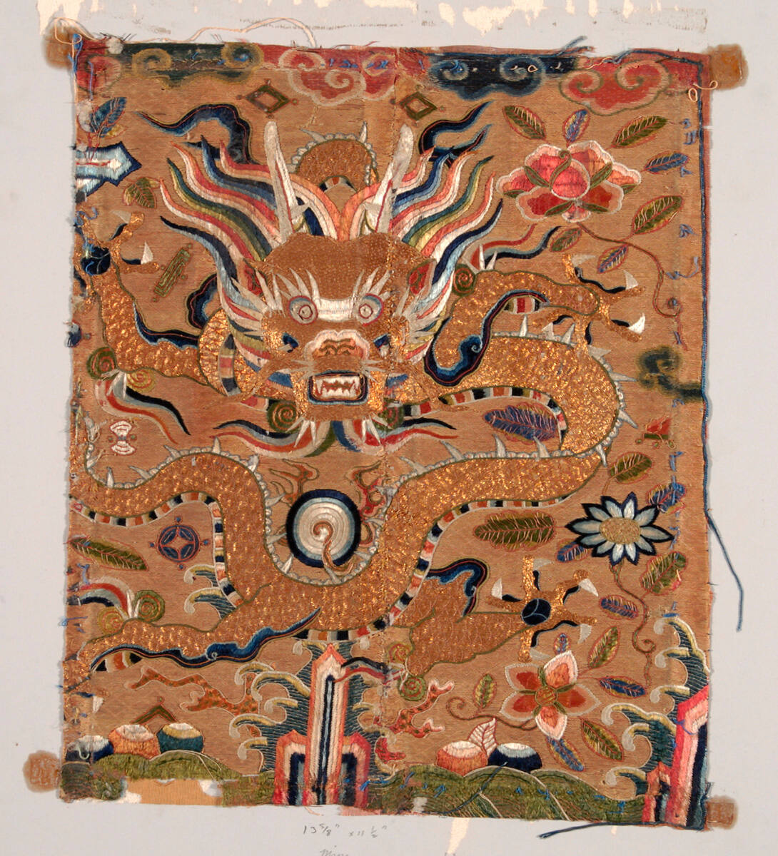 DescriptionGold dragon, full face, chasing flaming jewels amidst flowers and clouds. Background of tan thread darned in diamond diaper pattern.