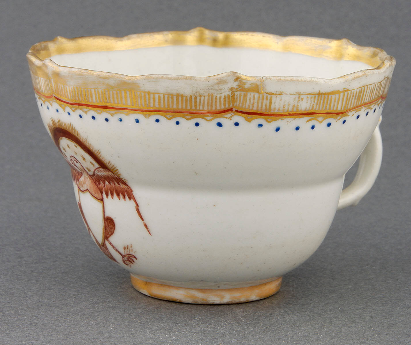 DescriptionCup with American eagle, gold, salmon and blue dotted borders.