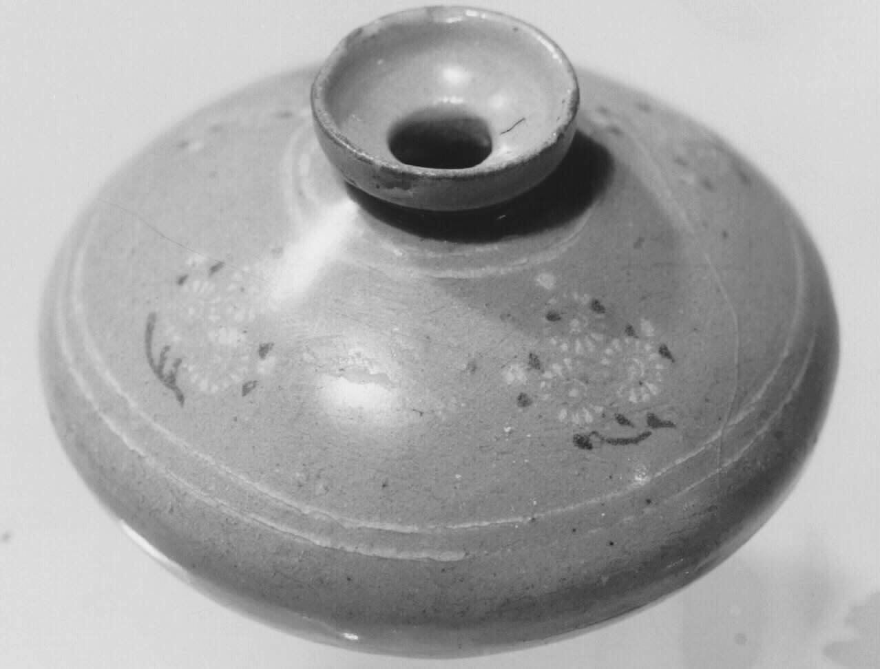 DescriptionSmall oil bottle with stylized chrysanthemum decoration. Light gray stoneware with decoration inlaid with black and white slip under celadon glaze.