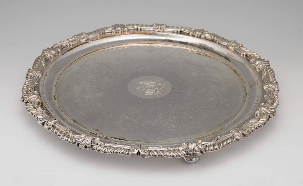 DescriptionA circular plate with a border of shell and gadroon, engraved with a coat-of arms; sits on three squat ball feet.