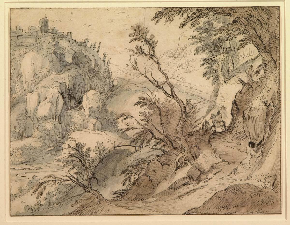 An Italian Panorama: The Romance of Ruins, The Nelson-Atkins Museum of Art, Kansas City, MO, July 19, 2017-January 14, 2018, no cat., as Rocky Valley with Castle.This imaginary view may have been inspired by the scenery in the foothills of the Apennines near Rome, where many towns are perched on hills overlooking deep valleys. Dramatic panoramas like this were favorites of Northern artists in Rome, like the anonymous author of this drawing, since they recalled the Alpine scenery they would have seen on their journey south.