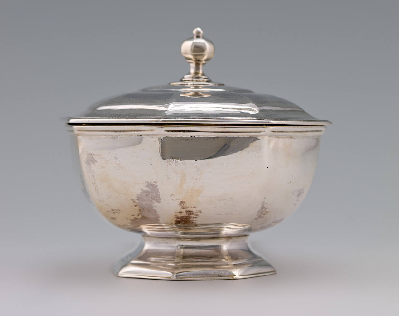 DescriptionPlain octagonal bowl on raised octagonal foot; low domed cover, sectional octagonal, surmounted with octagonal finial.