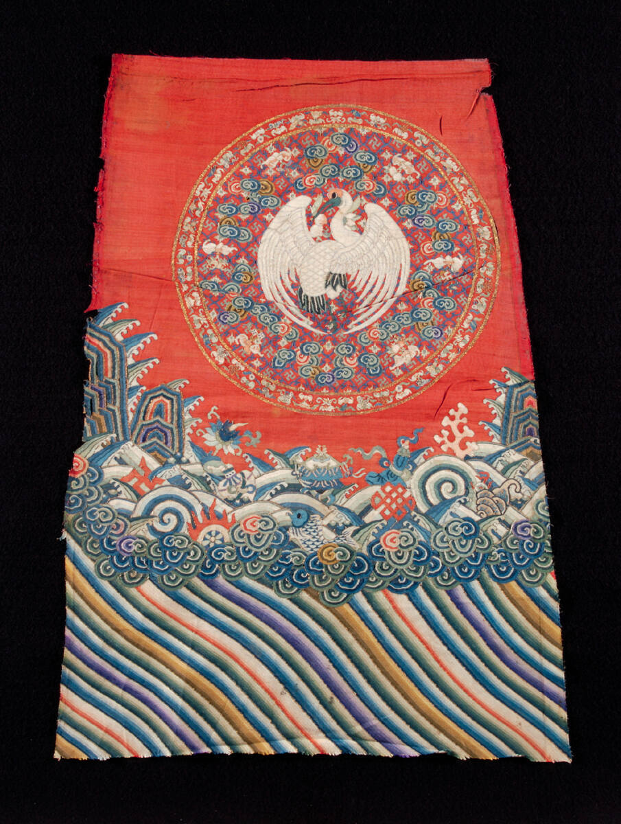 DescriptionFragment of the bottom of a coat, large medallion with white stork, wave pattern at the bottom. Red ground.