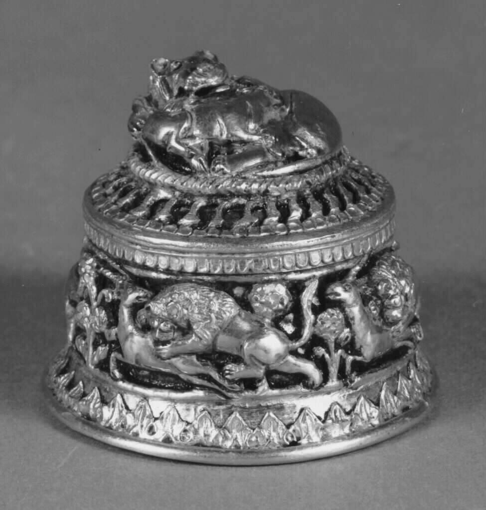 DescriptionSilver box, round in shape, with sides decorated in low relief, showing lions attacking deer. Separate cover in lot relief showing a lion in reclining position feeding on a deer. Partly gilt.