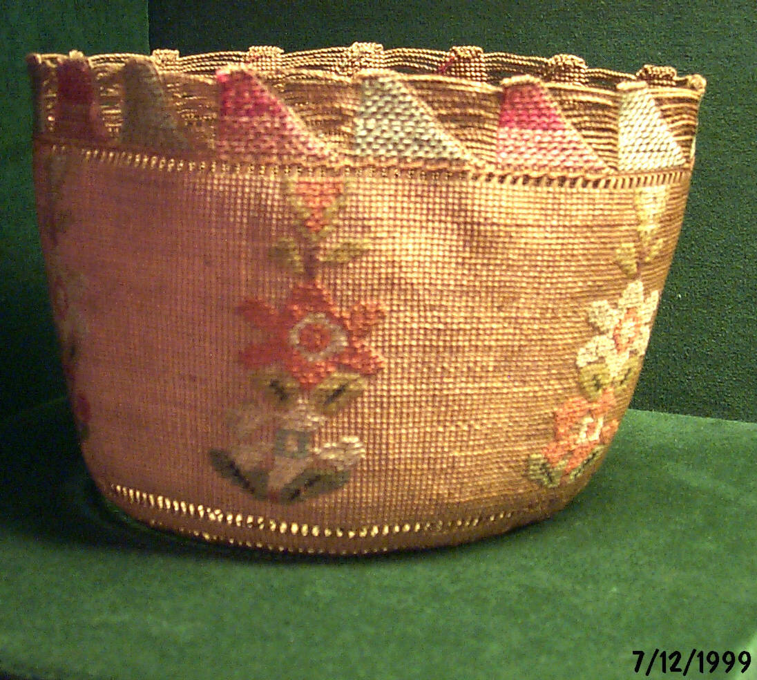 DescriptionSilk embroidered basket. top in blue and pink silk embroidery.