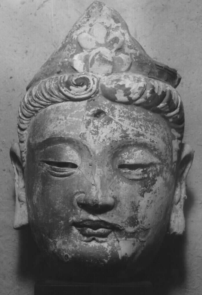 DescriptionHollow cast iron head covered with stucco. Brown face, delicate features. Deep line indicating shape of lower part of nostril and below eyes. Glass eyes. Indentation in forehead. Hair in stylized scrolls, green. Simple triangular headdress. Headdress is modern, restored in plaster.ProvenancePurchased on the Chinese art market, through Laurence Sickman, by The Nelson-Atkins Museum of Art, Kansas City, MO, 1933.