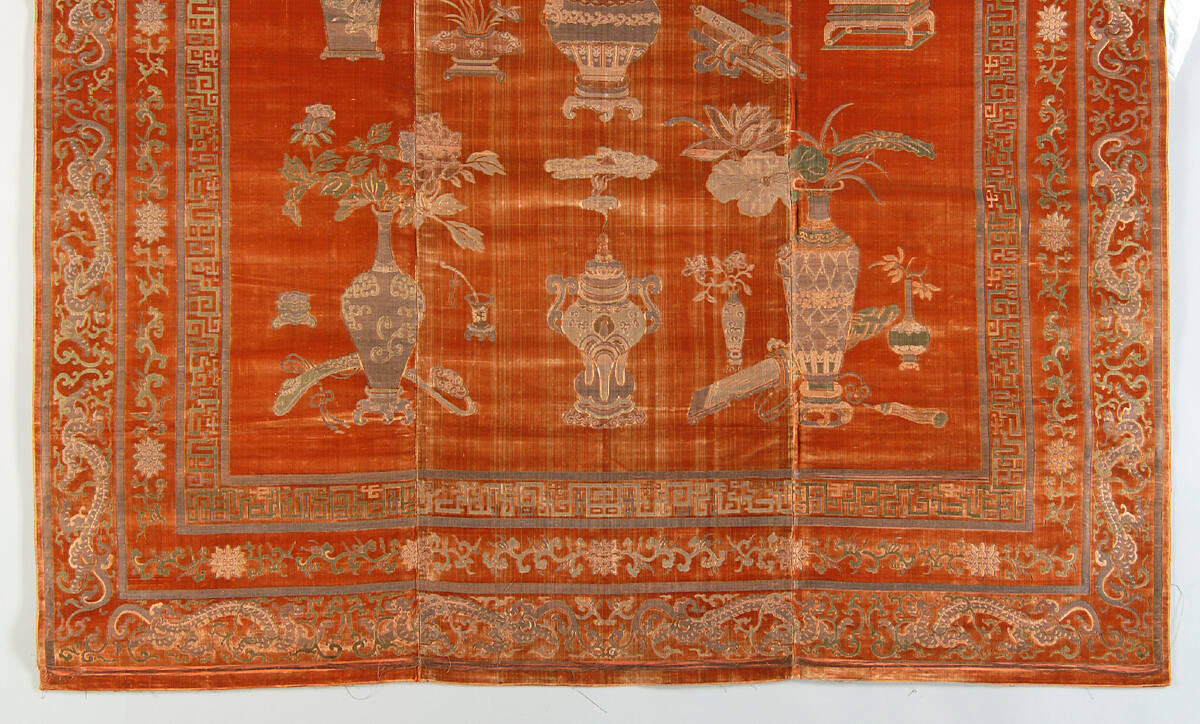 DescriptionOld rose cut velvet brocaded with threads of gold and silver. Wall hanging from the Imperial Palace of Peking.