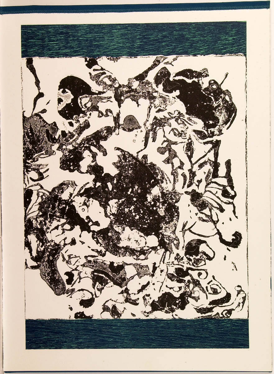 DescriptionBlue horizontal woodcut zones, top and bottom; design in black on white of aquatinted free forms whirling about larger dismembered circle with interior white dots and blotches.Copyright© Norman J. Wagner
