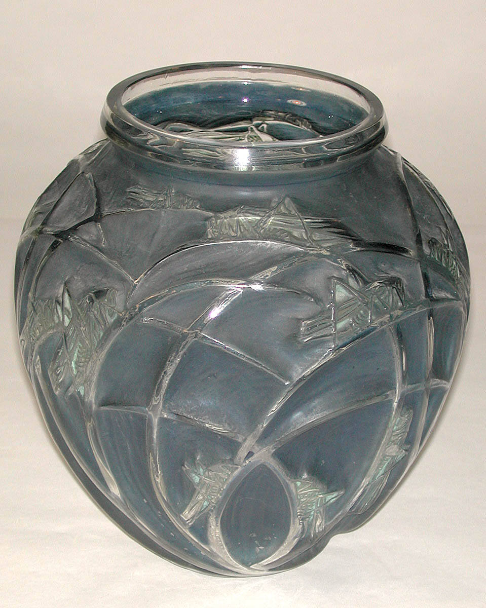 DescriptionOblated spheroid shaped glass vase with mainly blue color and clear relief decoration of narrow grass blades and grasshopper design.