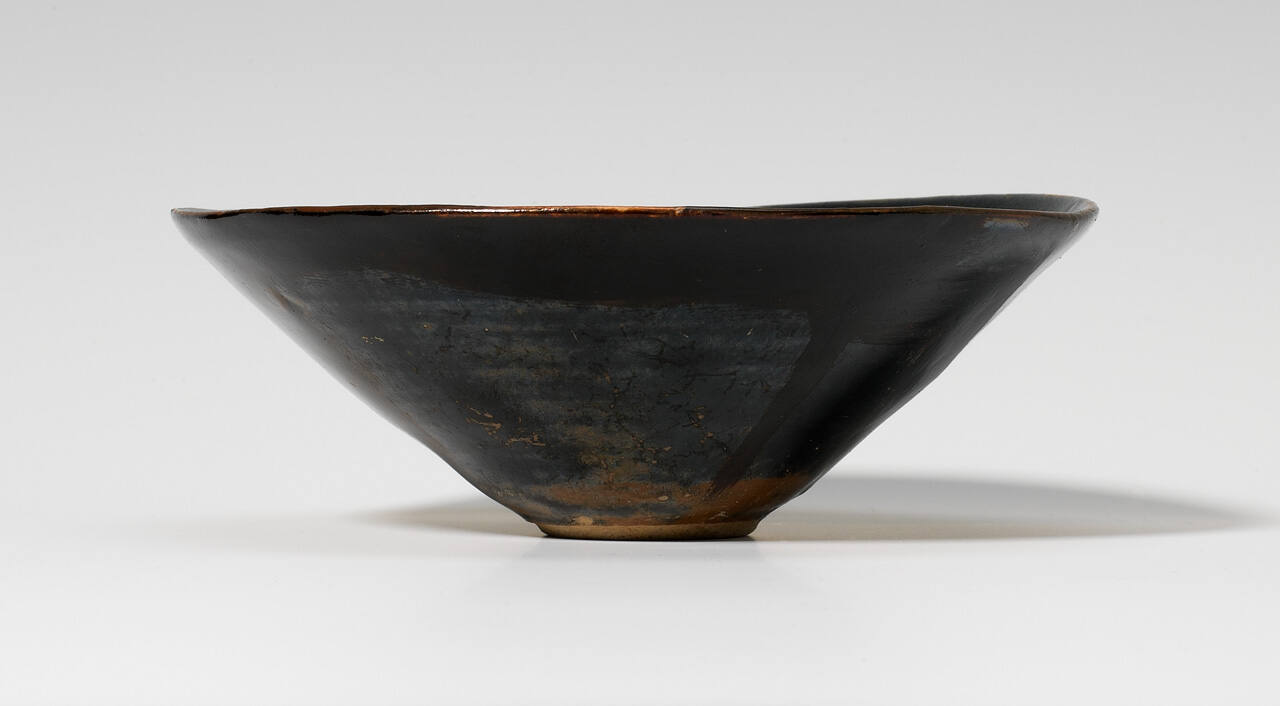 DescriptionBrown glazed bowl with a brown and tan leaf inside; with a box.