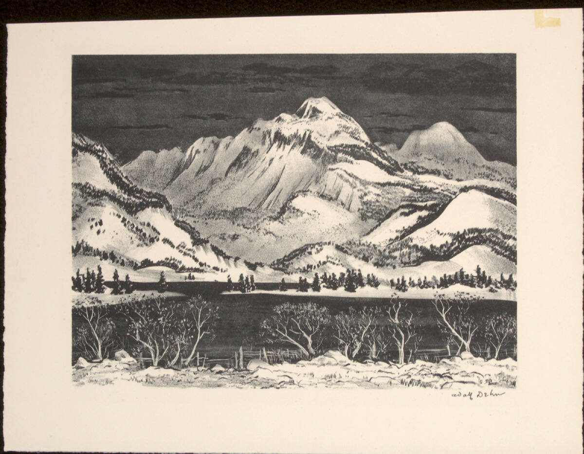 DescriptionLandscape with snowy mountains in the background and a clearing in the middleground (water?). In the foreground is more snow and some trees.Copyright© Estate of Adolf Arthur Dehn