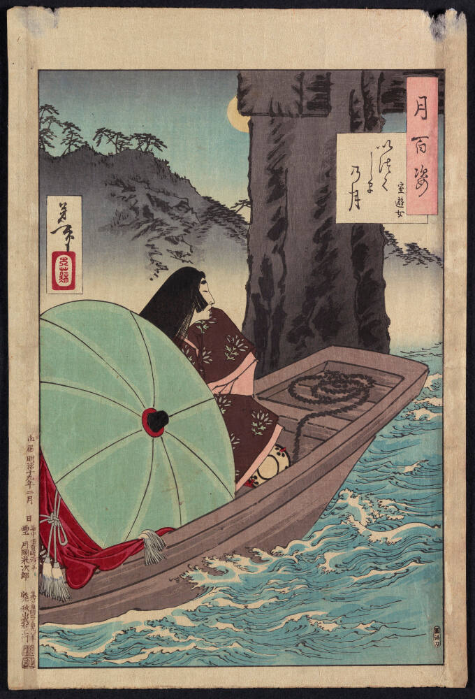 DescriptionA woman in a boat approaches an island under full moon. The boat is pulling up to the rock gate of a shrine, seen in the background. The woman's gigantic traveling hat with its heavy veil lies beside her; a drum is placed underneath her robes.Gallery LabelUkiyoe ("pictures of the floating world") woodblock prints were widely admired during the Edo period (1615-1868), especially the 1700s. Tsukioka Yoshitoshi was one of the last ukiyoe artists popular with collectors in the late 1800s.
