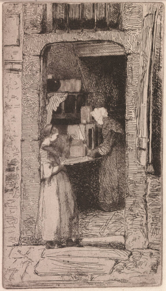 Gallery LabelLa Marchande de Moutarde is one of Whistler’s most important early etchings. It introduced him to the European art world when it was shown at the Paris Salon in 1859. This glimpse through a narrow doorway to a woman sealing pots of homemade mustard (a specialty in Cologne) is made of delicate linear patterns. The variety of textures suggested by the lines and the tight composition are characteristic of Whistler’s early etchings.