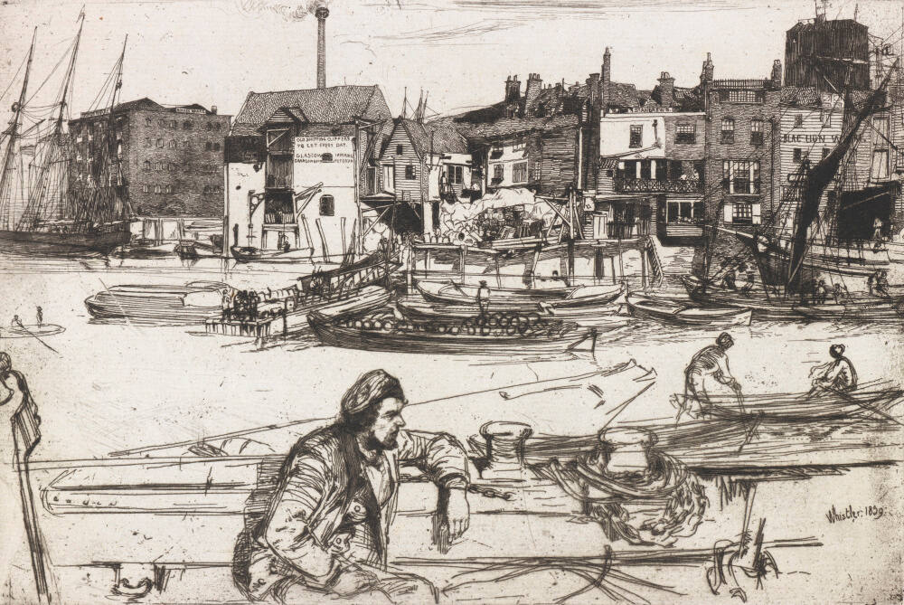Gallery LabelThis shows the busy life of London’s waterfront, but in a calm, detached way. Small boats were used for short distance transport along the river, and to carry people and goods to waiting ships. The foreground is lightly etched compared to the buildings, a technique conveying a sense of receding distance.