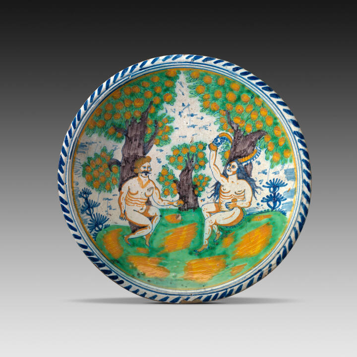 DescriptionDecorated with figures of Adam and Eve, each seated on grassy bank under a tree in manganese with green leaves and yellow fruit against clouded blue sky. Adam wears cavalier moustache; Eve offers fruit to serpent coiled around tree.Gallery LabelScenes of Adam and Eve in the Garden of Eden were popular subjects of prints in the 17th century and were often depicted on delftware dishes.