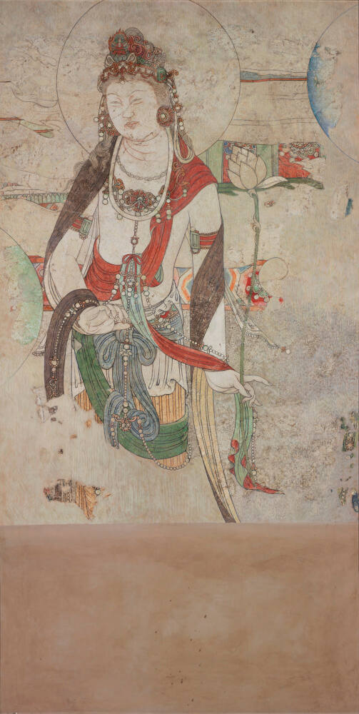 When a small break in Two Bodhisattvas Burning Ritual Incense (50-64 A) revealed color within the clay foundation, Museum conservators determined that the painting had been done on a surface plastered over a previous work. The two paintings were carefully separated and revealed this bodhisattva of an earlier period. Because this painting was preserved under the mud plaster, the colors remain fresh. Some areas have been restored to integrate the composition. This earlier painting is rendered in a much simpler style than the other two. It incorporates broader areas of color but simplifies the surface decoration. The figure in the shape of a fluid "S" curve resembles many Tang dynasty sculptures. These stylistic elements suggest that it predates the images in the other two paintings.
