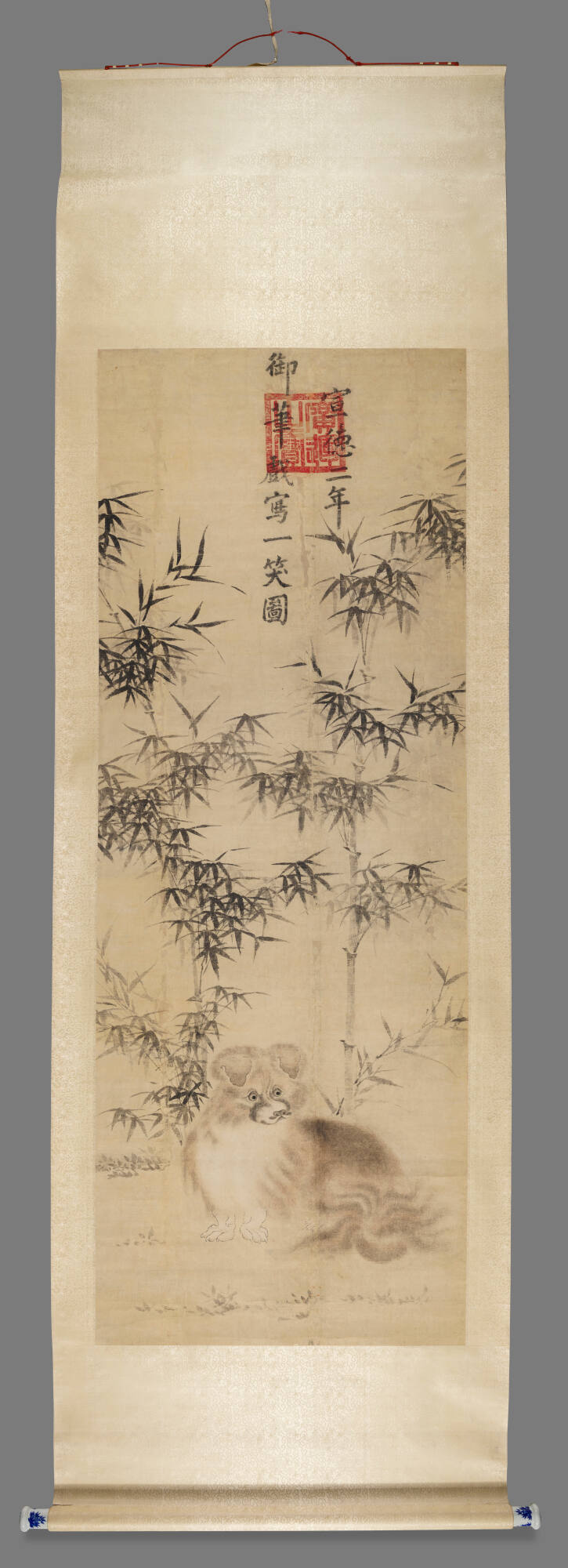 While ruling a vast empire, Zhu Zhanji developed a specialty in painting animals, particularly dogs. This arrangement of a Pekinese beneath two bamboo stalks illustrates the Chinese character xiao , which consists of two bamboos above a dog . Xiao means smile or joke, and this witty painting hints at the use of humor to defuse political tensions in the court.