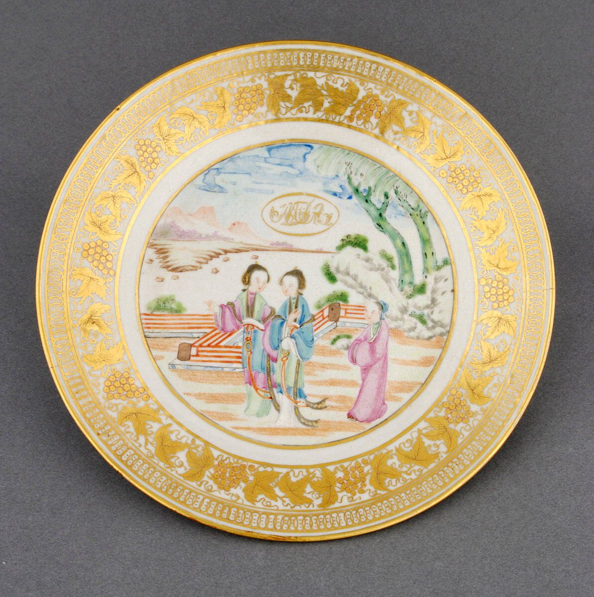 DescriptionPart of seventy-seven piece tea and coffee service. On interior sides of all pieces is border design in gold of grape bunches and leaves.
