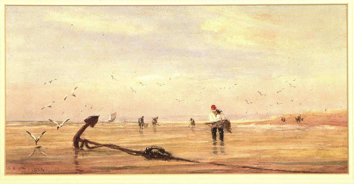 DescriptionSeaside scene with fisherman standing in shallow water, center; large brown anchor resting on its side in left foreground; other fishermen visible in background; and soaring sea gulls in pale sky above.Exhibition HistoryN/A