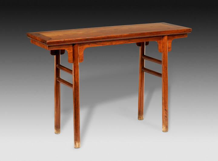 DescriptionA huanghuali rectangular table with typical mitred, mortise and tenon from top with a flush floating panel top with inset round legs cut to receive the undecorated square joined shaped aprons with two oval shaped stretchers joining the legs from to back.Exhibition HistoryFrom Ming to Ch'ing, The Taft Museum,