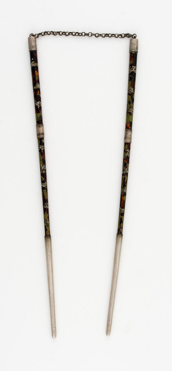 DescriptionOne of a pair of tortoise shell chopsticks with silver tips fastened together with silver chain.
