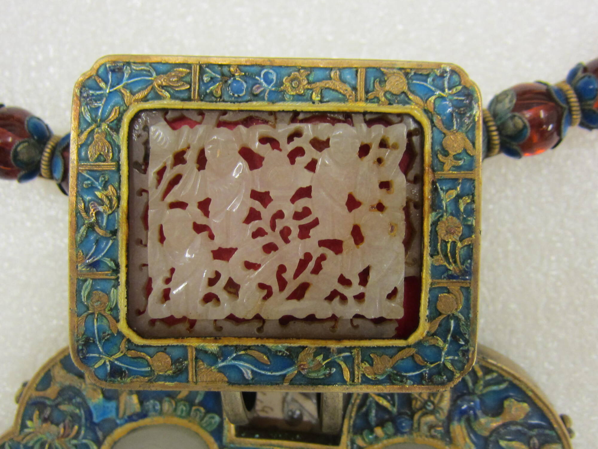 DescriptionCarved white jade in rectangular gold and enamel frame. Part of a necklace.