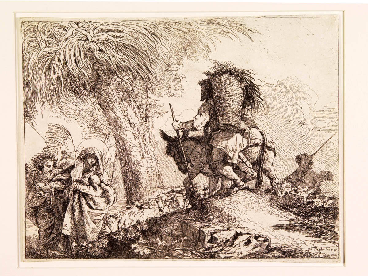 Giovanni Domenico Tiepolo reenacts the drama of the Holy Family's long and dangerous journey in his series The Flight into Egypt. Nine of the twenty-seven plates show the fugitives trudging through the countryside. In this etching, Joseph strides past the crest of a pyramidal hill that descends sharply to the left. Its diagonal slant draws attention to the weary Virgin Mary, relegated to the very edge of the image. Details such as the basket, flock of sheep, and thatch of vegetation bordering the path ground the sacred subject in everyday reality.