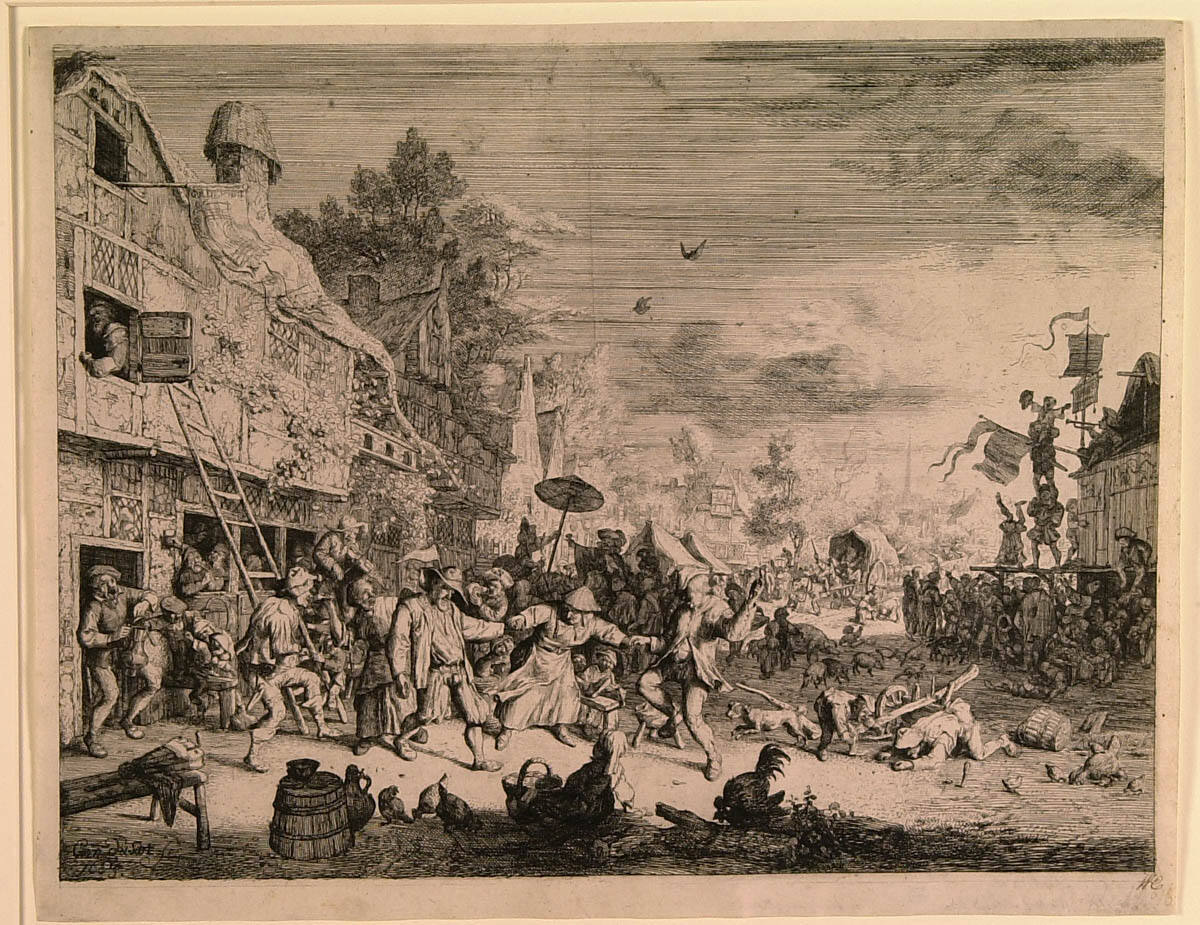 Gallery LabelDepictions of merrymaking were as much a part of the 17th-century Dutch pride-of-place and material prosperity as the marvelously descriptive paintings of Dutch still life, architecture and domestic interiors. These village celebrants have gathered for a festival in which music-making, dance and considerable consumption of tavern ale are the main attractions. In the left foreground, with a flag in his hat, a blind, itinerant hurdy-gurdy player has left his instrument on a bench to accommodate a couple coaxing him to dance. The lively scene occurs beneath a sky described by finely etched horizontal and diagonal lines with areas of white corresponding to unworked areas of the plate.