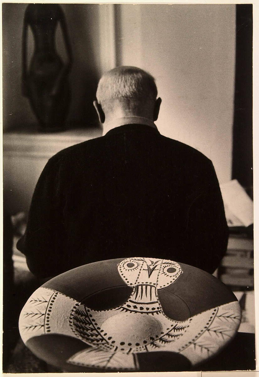 Picasso Starts to Paint Plates; Bronze Head of Dora Maar Above. Colors on Plates After Firing, and Examines Other Newly-painted Plates Before Firing
