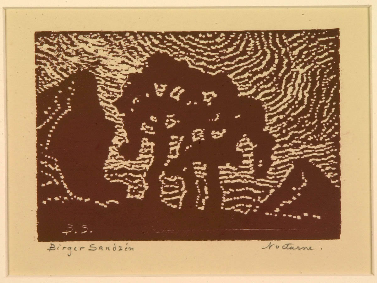 Sandzén had only recently taken up printmaking when he created this delicate night landscape. Nocturne's dark, abstract qualities and the musical evocation of the title align it with the "art for art's sake" philosophy promoted in the 19th-century by painter James McNeill Whistler. Landscape remained Sandzén's primary subject, although he developed a more structural style indebted to French Post-Impressionist Paul Cézanne.