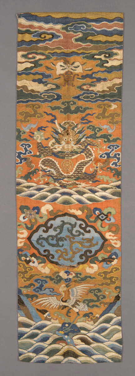 DescriptionChair cover decorated with dragons, waves, clouds, phoenixes and flowers in blues, greens and golds. Lined with salmon silk brocade.