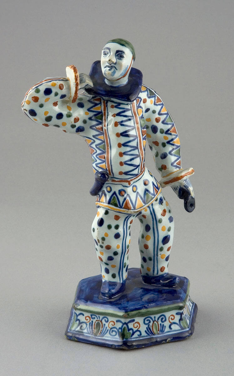 DescriptionArlecchino type figure with legs apart, right hand to collar, head turned to r. stands on hexabonal base with floral decoration in red, blue and white; wears white mask, green skull cap, red chin strap, blue ruff, suit of multi-colored geometric pattersn, blue shoes; holds black hat in left hand; letter "P" in red on bottom.
