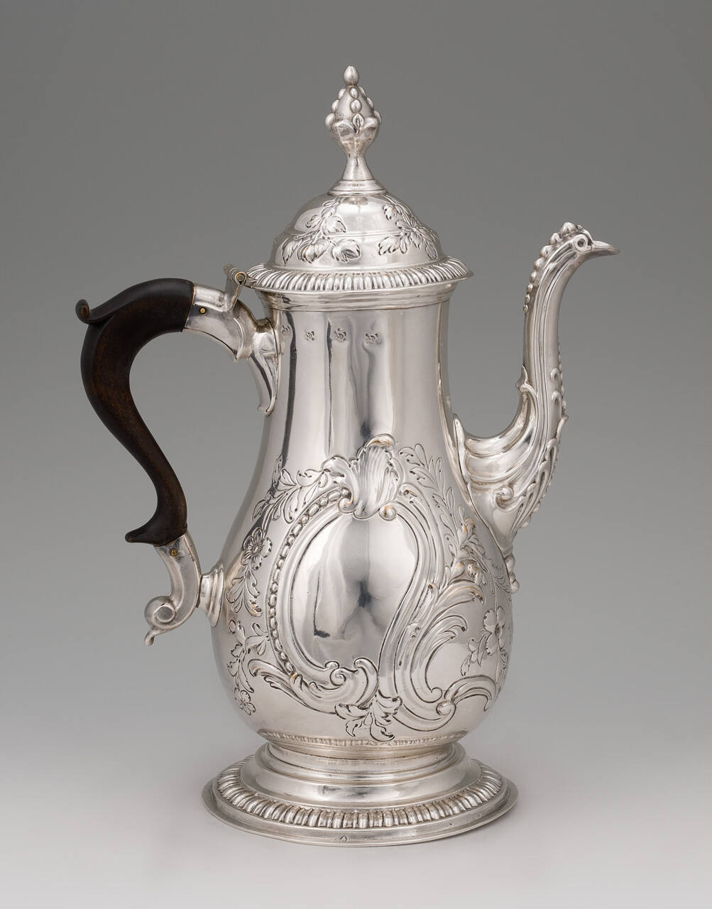 DescriptionLarge pear-shaped silver coffee pot engraved with a coat-of-arms; the body has floral decoration; the foot and cover are decorated with straight gadroon; the spout has leaf decoration. Double scroll wood handle.Gallery LabelAlthough this coffee pot seems to be silver, it is an early example of Sheffield plate, eponymous with its place of invention in England. In 1742, Thomas Boulsover discovered that copper fused between two, thin layers of silver could be shaped as one metal while appearing to be sterling silver, thus reducing the material cost. Sheffield plate was a boon to the burgeoning middle class desirous of emulating the upper classes with affordable alternatives. Displaced by electroplated silver in the mid-1800s, Sheffield plate is prized for its warm lustre.