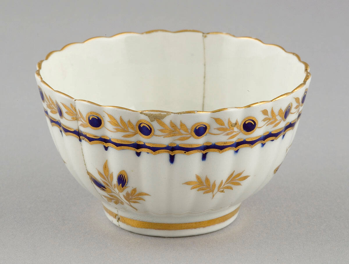 DescriptionDemitasse cup of white porcelain with fluted sides, decorated with single flower and leaf designs in gold and blue, and continuous leaf pattern around top.ProvenanceMargaret Cameron Chapman (née Mann, 1865-1935), Kansas City, MO, by 1935;