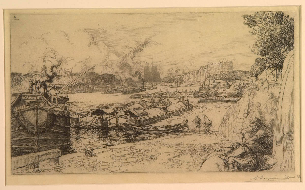 Scenes of working-class neighborhoods, factories, and industry were elevated in status by avant-garde painters and printmakers in the last quarter of the 19th century. Depictions of billowing smokestacks and blue-collar workers coincided with images of Paris’s grand boulevards and well-to-do residents. Auguste Lepère specialized in printmaking, and his favorite subject was Paris and its inhabitants. The Seine River at the Mouth of the Canal St. Martin positions the viewer among the barge workers on the docks of the Seine River, with the dark silhouette of Notre Dame Cathedral just visible through the smoky haze on the horizon.
