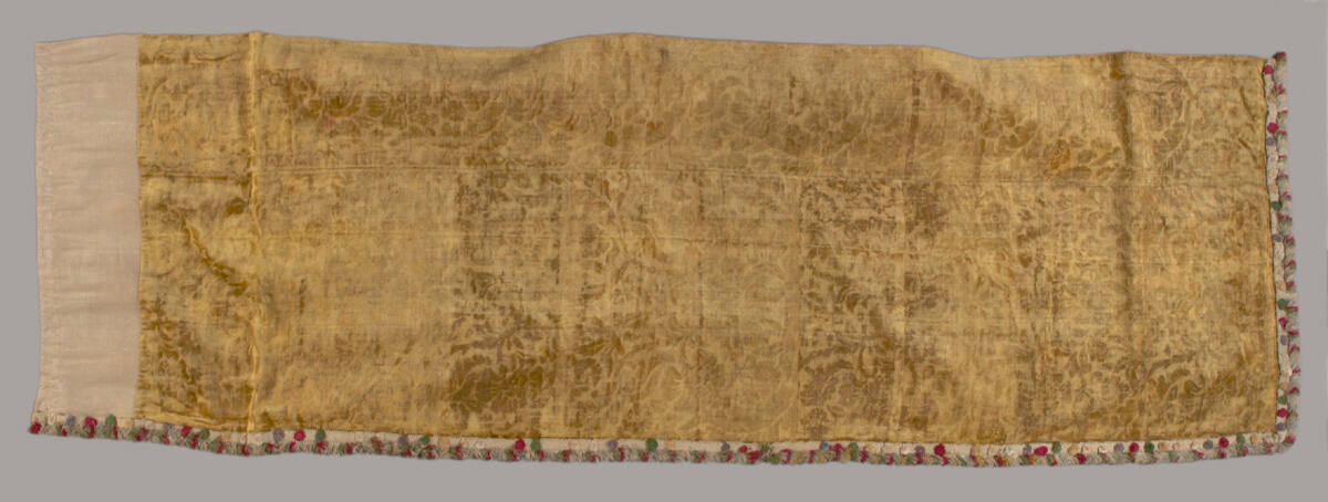 DescriptionOriginal fringe in cream, red, gold and green. Originally bed spread? Divided to make two curtains and valance.ProvenanceWith Keller and Funaro, by May 21, 1929;