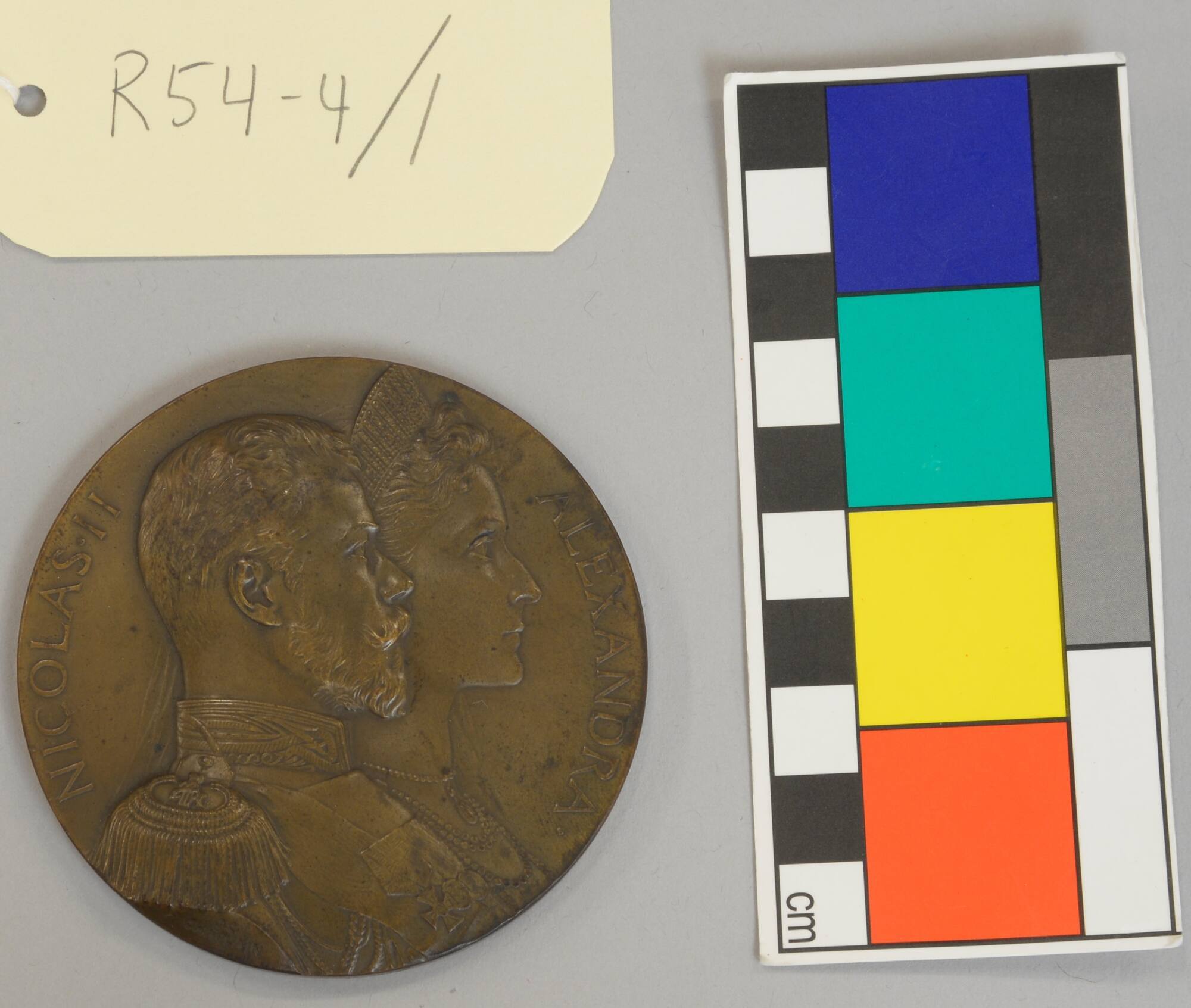 DescriptionObverse: bust, right profile portraits of Nicolas II and Alexandra; inscribed "Nicolas II" and "Alexandra" at right and left edges, respectively. Reverse: top, Russian imperial arms; center, seven-line French inscription in capitals; bottom, garland.
