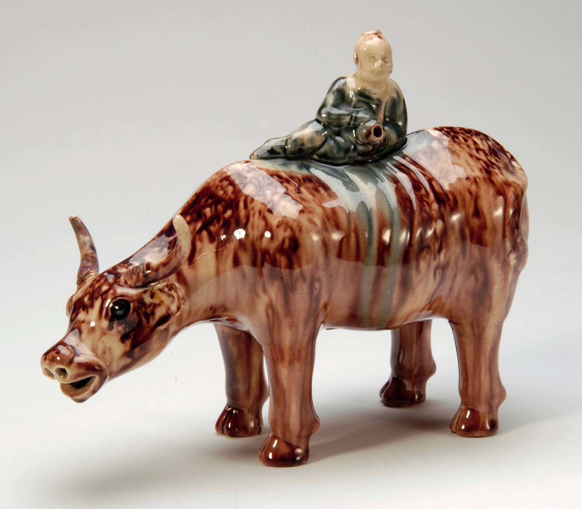 DescriptionHighly glazed with warm manganese brown over cream. The oxherd, a Chinese, with faint yellow head and dressed in a quiet blue robe, rests lengthwise on the buffalo's back and holds a wine jar.