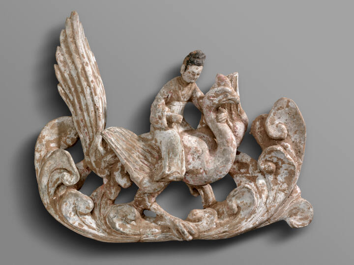 DescriptionGray clay figure, with traces of pigment and earth encrustations. Figure is of a woman riding on a large bird facing to the left.