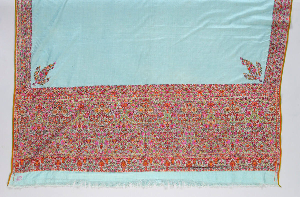 DescriptionCenter field of light-blue twill embroidered with a boteh on each corner. Borders with an all-over floral design, made of twill tapestry combined with embroidery.Exhibition HistoryJohn Donnelly (1932–2020), Kansas City, MO, by 1990;