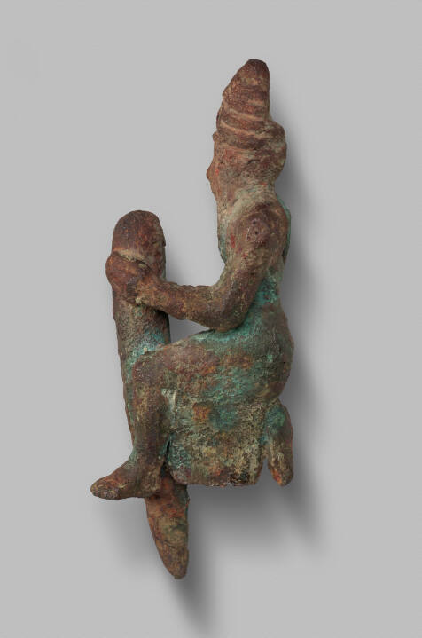 DescriptionCrouching statuette of king with hand and high headdress, holding long object, fine blue and red patina.Gallery LabelThis figure was set onto mud bricks in the foundation of a temple. Its placement was meant to magically protect the building. The bull horns on figure's cap indicates that a god is portrayed: the same device reappears more than a thousand years later on the large relief to your left.