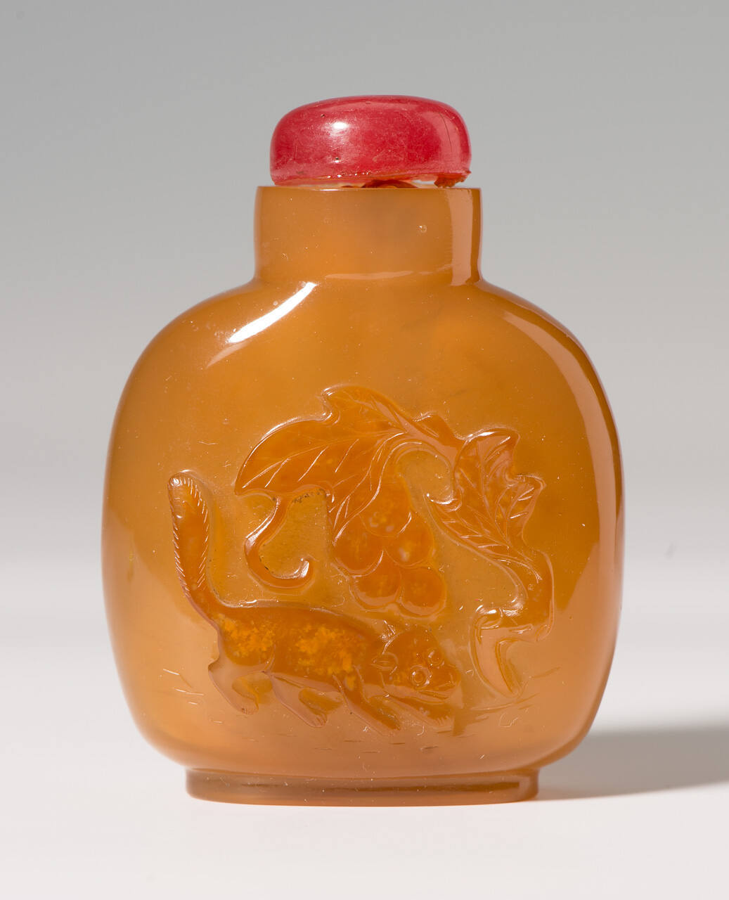 DescriptionNarrow-sided quadrangle golden beige translucent agate bottle with cylindrical neck, carved in high relief on one side with a squirrel approaching a grape vine, pink glass stopper.