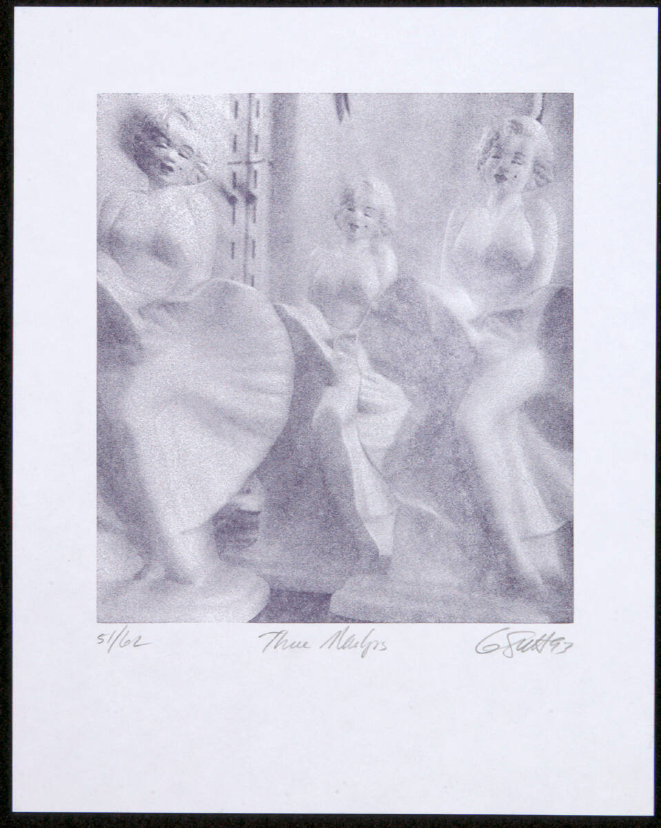 DescriptionBlurred image of Marilyn Monroe with skirt blowing up over waist, leggs exposed, repeated three times; one at left, second at right, third, slightly smaller, in-between and behind the other two images.Copyright© Gary Sutton