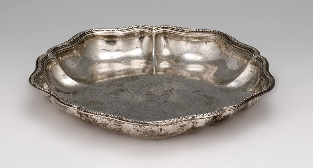 DescriptionPentagonal shaped dish with scalloped and beaded edge. Coat of arms in the center. Marks on bottom: date m, leopard's head crowned, PC (script), lion passant. Inventory marks: N4 22=16.