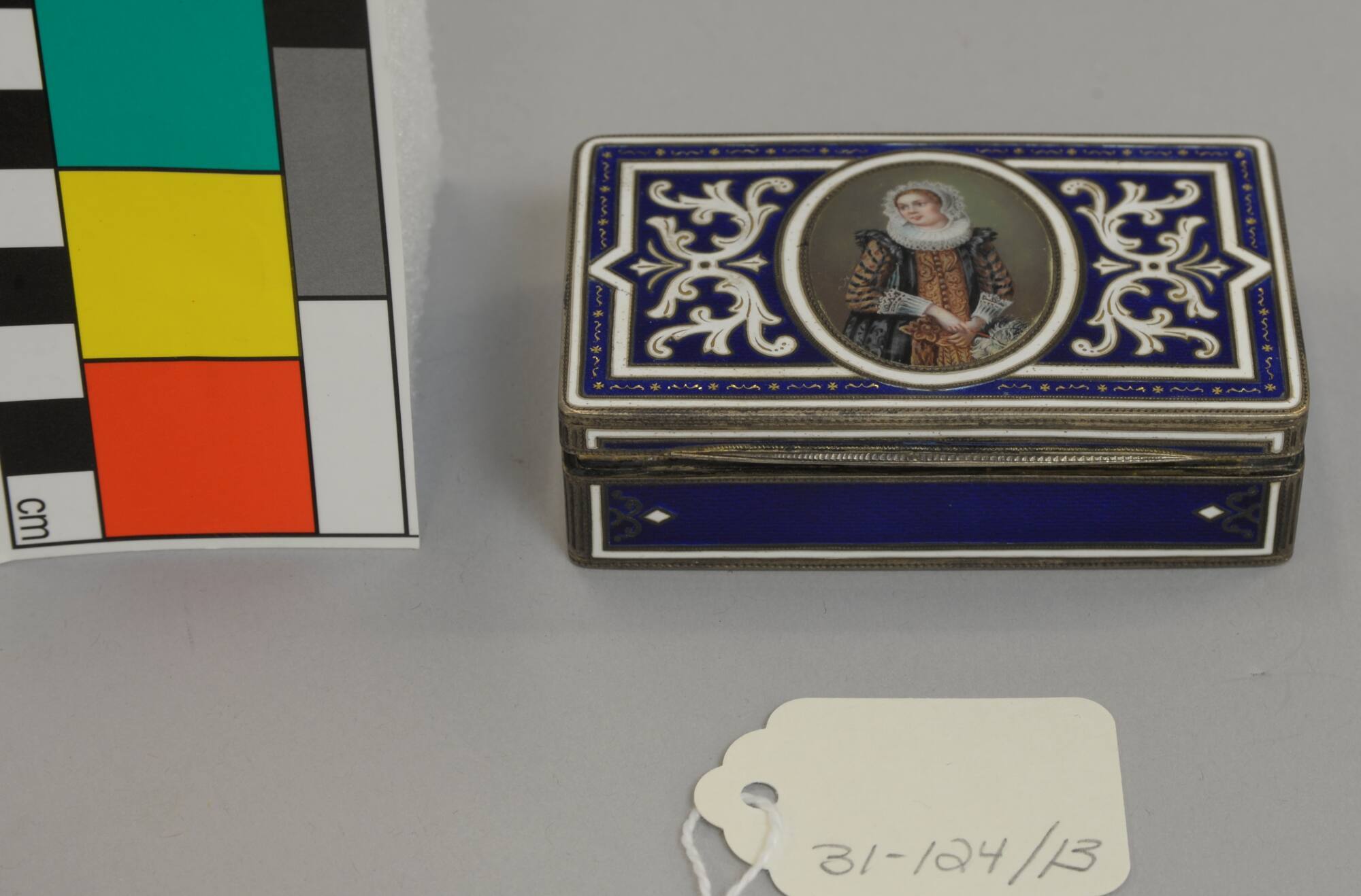 DescriptionGold, blue, and white enamel. Miniature of a lady on the top.