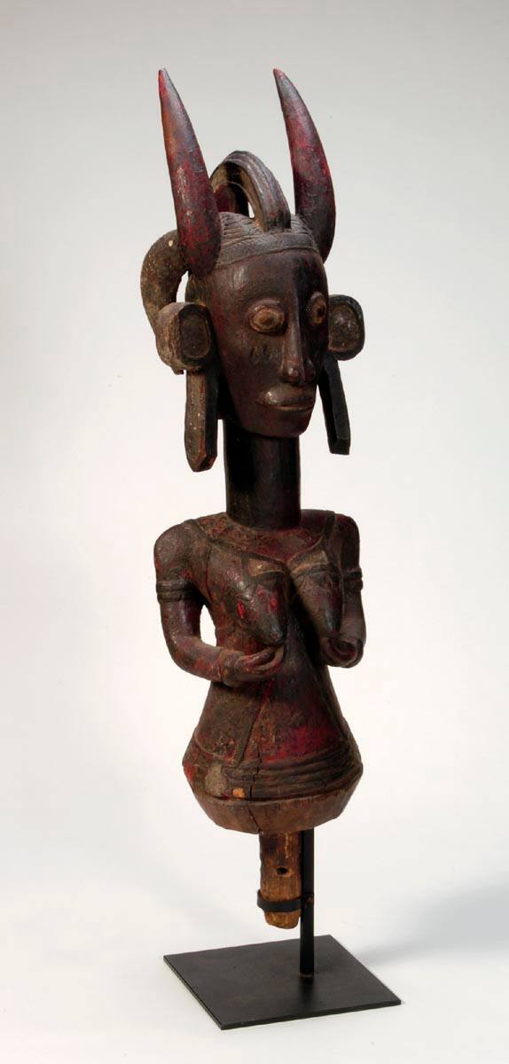 DescriptionHip-length female figure with post-like base mounted on metal stand. Elongated neck and head, bulging eyes, protruding stylized ears, and long dangling hairdo with horns extending vertically from head. Arms at sides with fingers touching tips of breasts. Raised impressions of arm bracelets on upper arms, and of "suspenders" crossed over back and front of figure; decorative bands around bottom of "skirt".ProvenanceWith Mathias Komor, New York, stock no. M859 [1];
